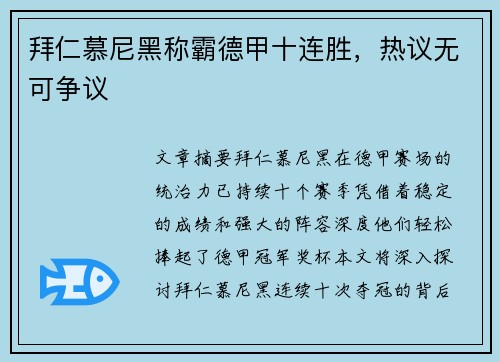 拜仁慕尼黑称霸德甲十连胜,热议无可争议